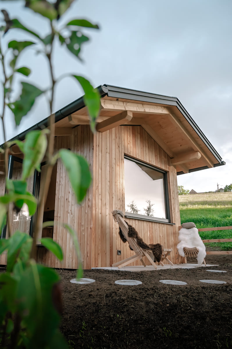 Sei drinnen – mit dem Gefühl draußen zu sein. Genieße das besondere Raumklima, atme den Duft von Holz und lausche dem Regen auf dem Dach. Alles ist durchdacht – auf kleinem Raum entsteht ein Gefühl von Ruhe und Weite. Ein geschützter Außenbereich verbindet Innen und Außen, umgeben von Natur, Vogelstimmen und stillen Momenten.